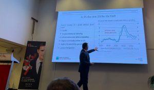 Les courbes projetées à l’écran montrent la baisse déjà engagée des taux directeurs mondiaux. La « global policy rate » glisse de 4,5 % vers 3,5 %, et devrait poursuivre sa décrue. En zone euro, les taux ont déjà été ramenés autour de 2 %, loin des 4 % atteints quelques trimestres plus tôt.